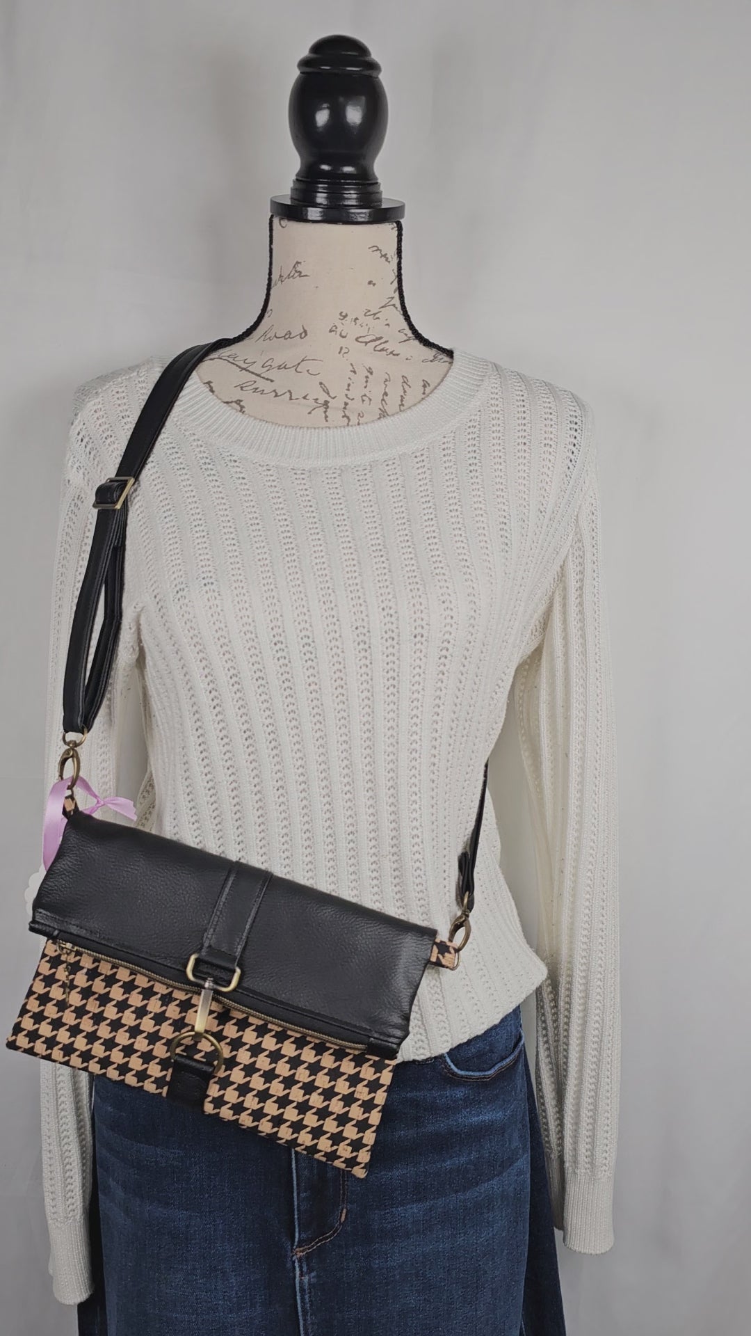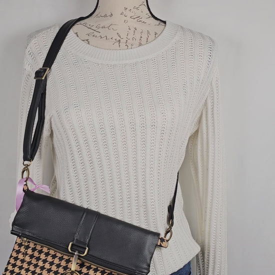 Black Faux Leather & Houndstooth Cork Fold-Over Crossbody Bag with Antique Brass Hardware