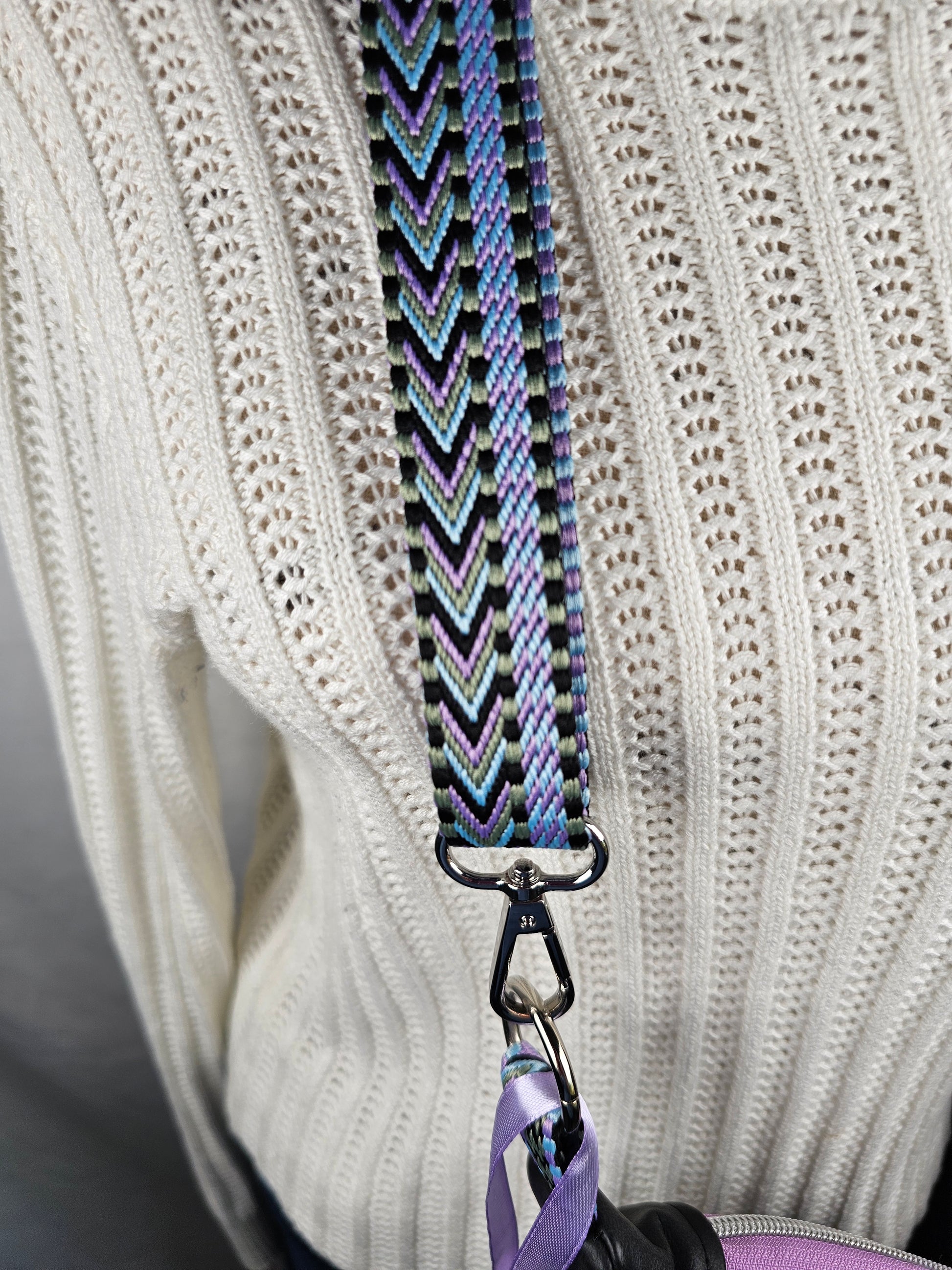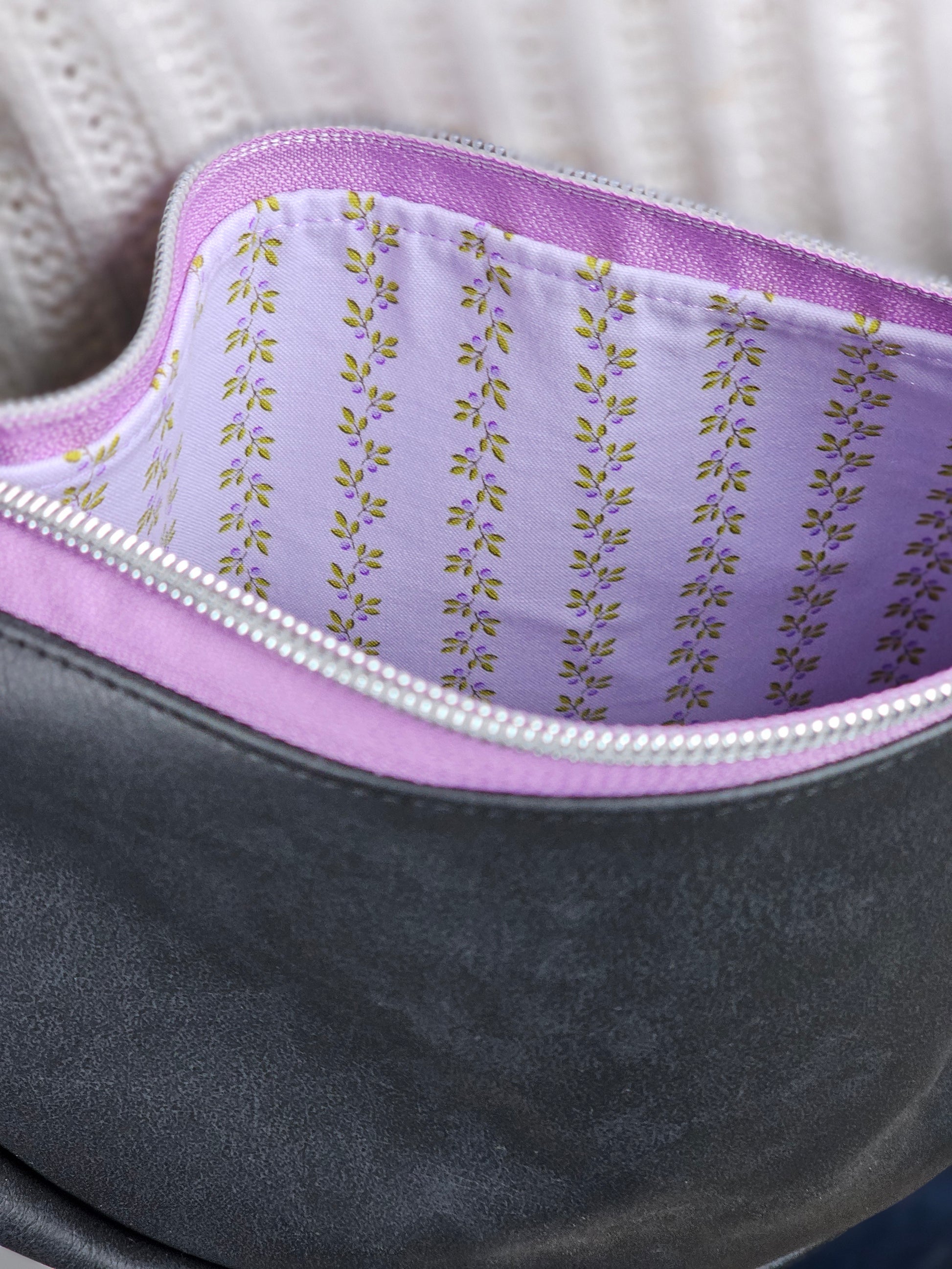 Bold and beautifully functional, this large crescent-shaped crossbody is crafted from smooth black faux leather for a timeless, elevated look. The roomy interior is lined in a soft French lavender cotton with a coordinating lavender zipper that adds a pop of color and charm.