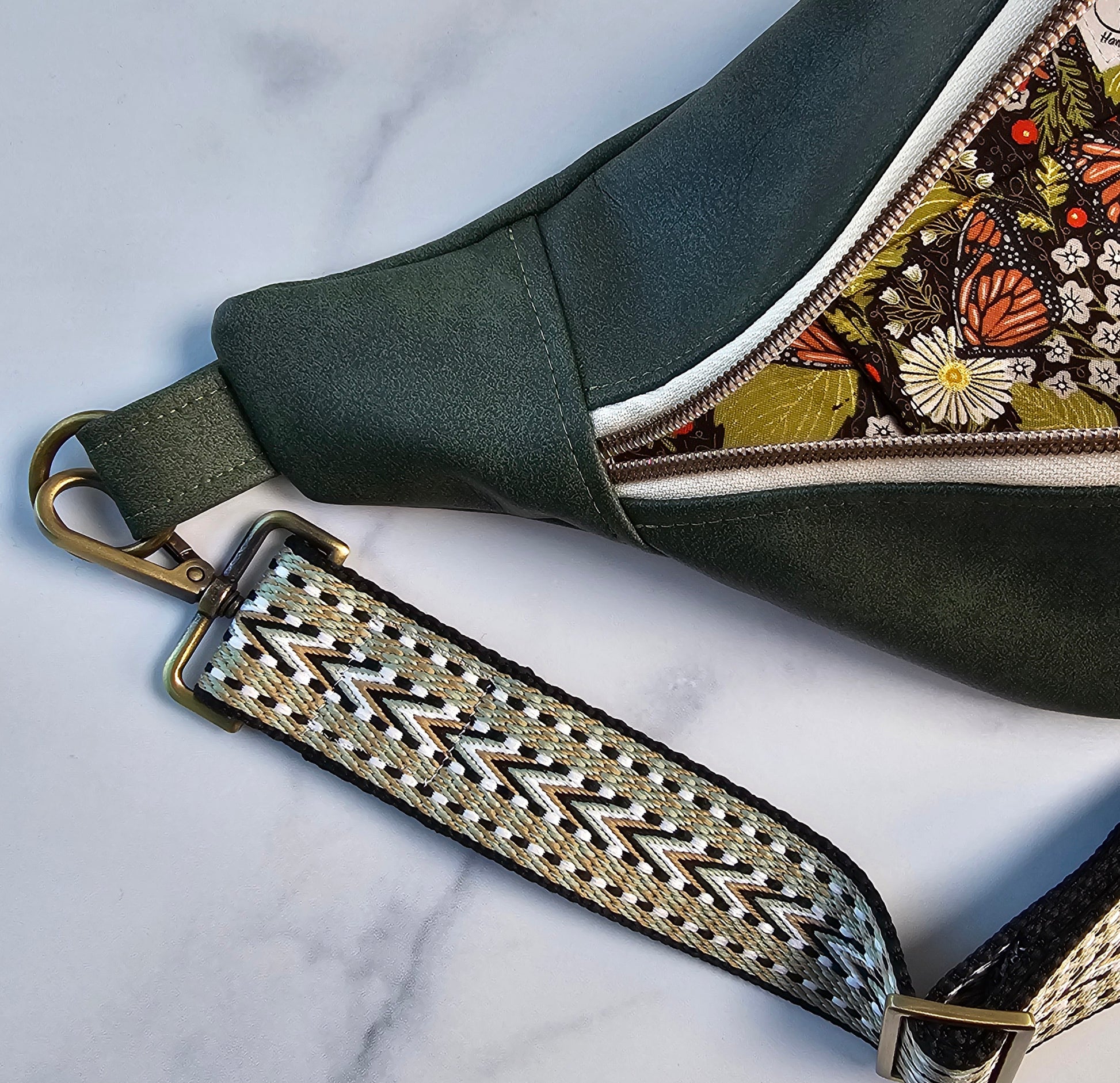 The 1.5 inch adjustable strap features a striking mix of greens, browns, white, and black - blending beautifully with the natural tones of the bag. Spacious, stylish, and ready for wherever the day takes you, this bum bag is equal parts function and flair.