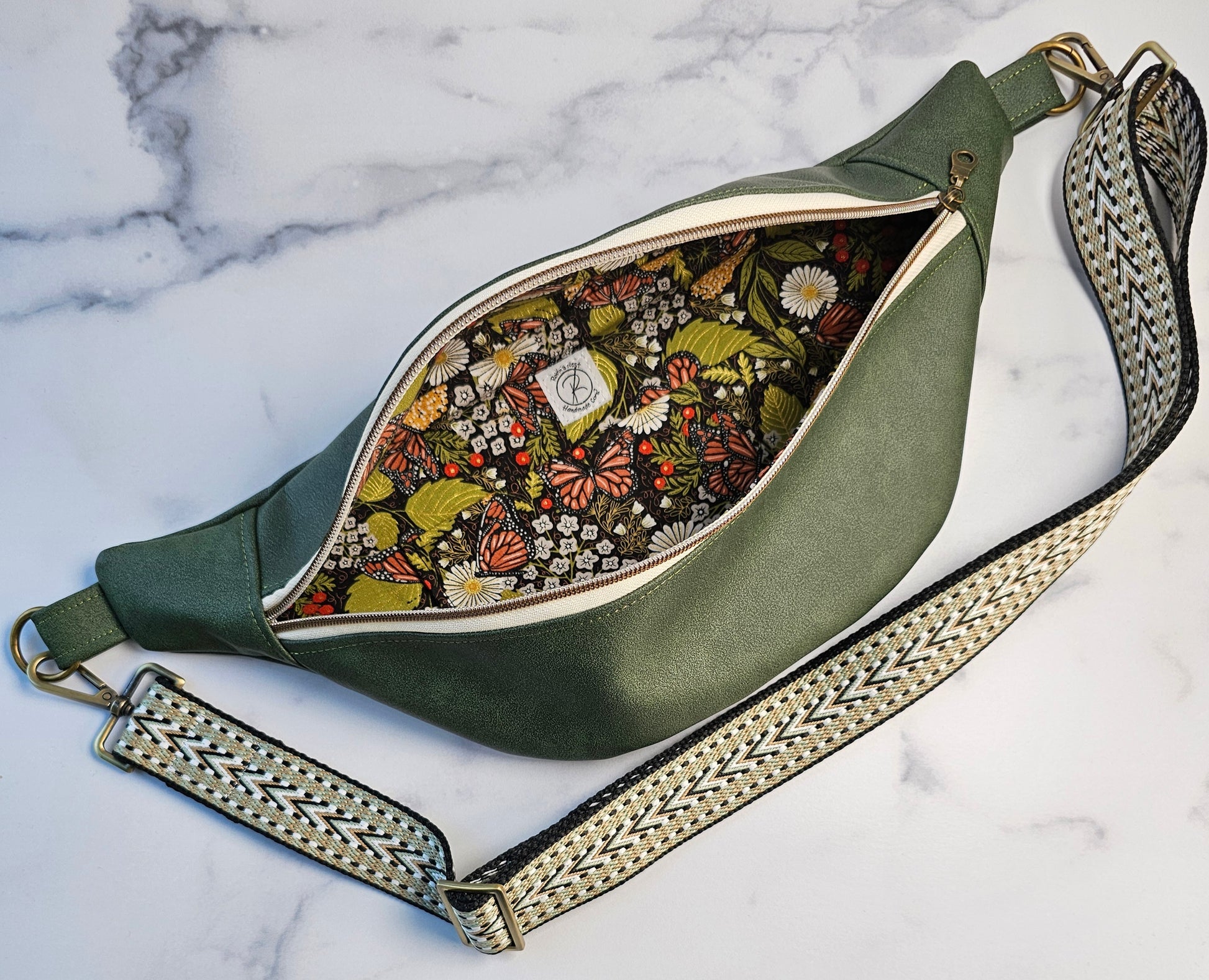 This earthy green faux leather bubm bag brings a touch of nature-inspired charm to your everyday adventures. Inside, you'll find a floral and butterfly cotton lining that adds a whimsical surprise each time you open it. A single slip pocket keeps your small essentials close and easy to find.