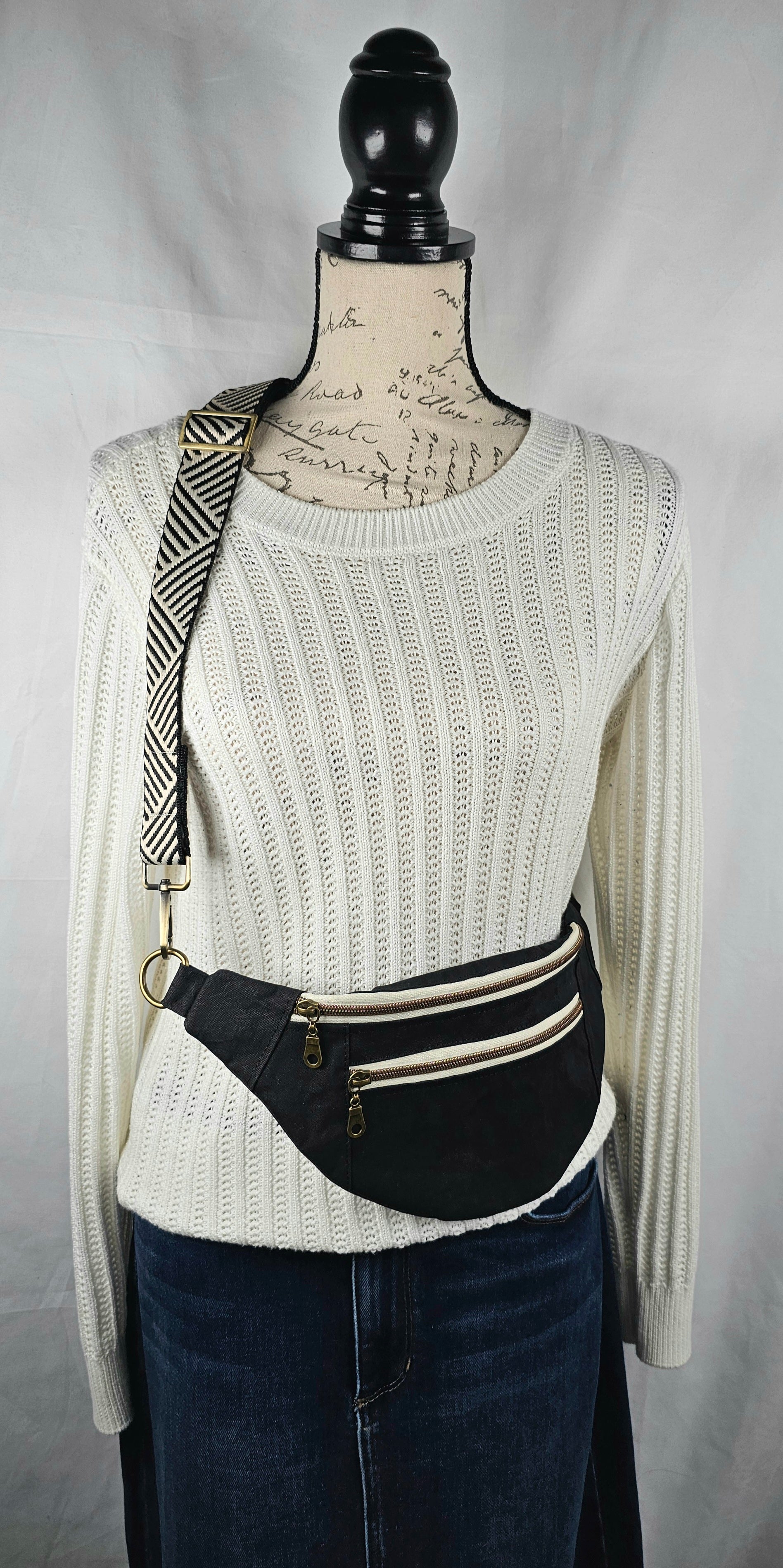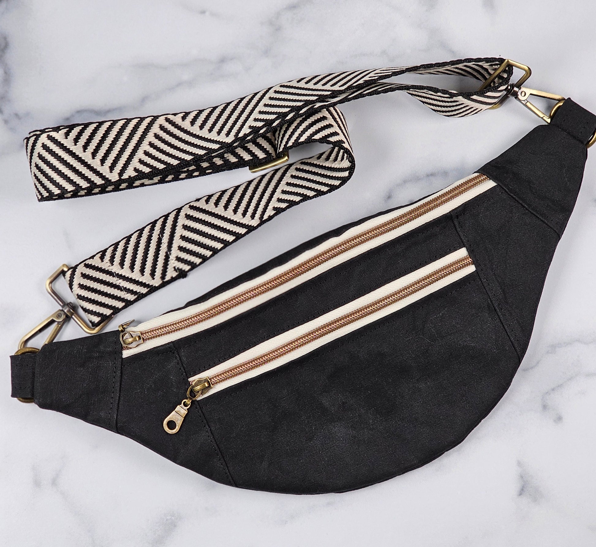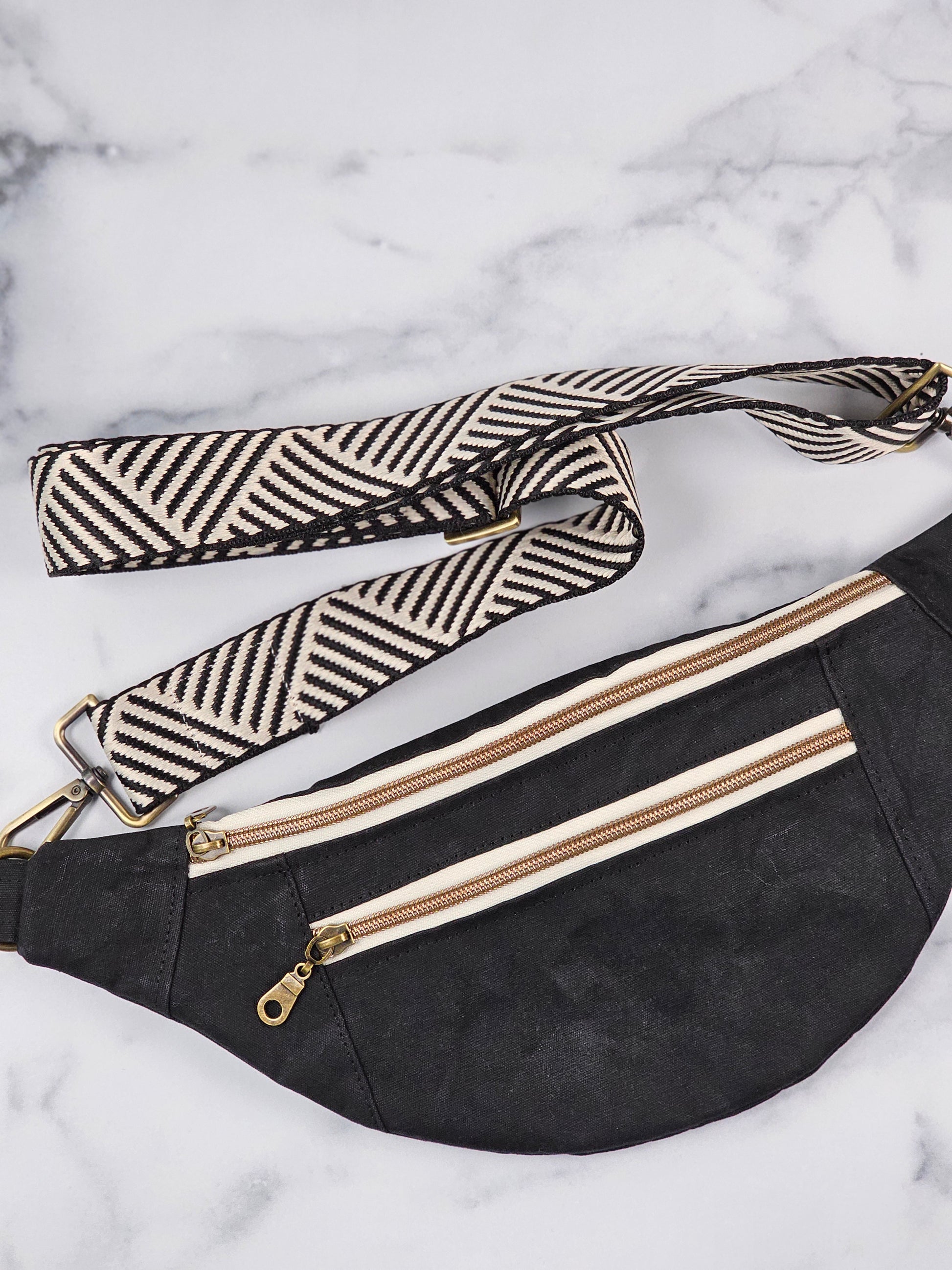 Black Waxed Canvas Bum Bag with Chevron Strap; Handmade Crossbody Fanny Pack