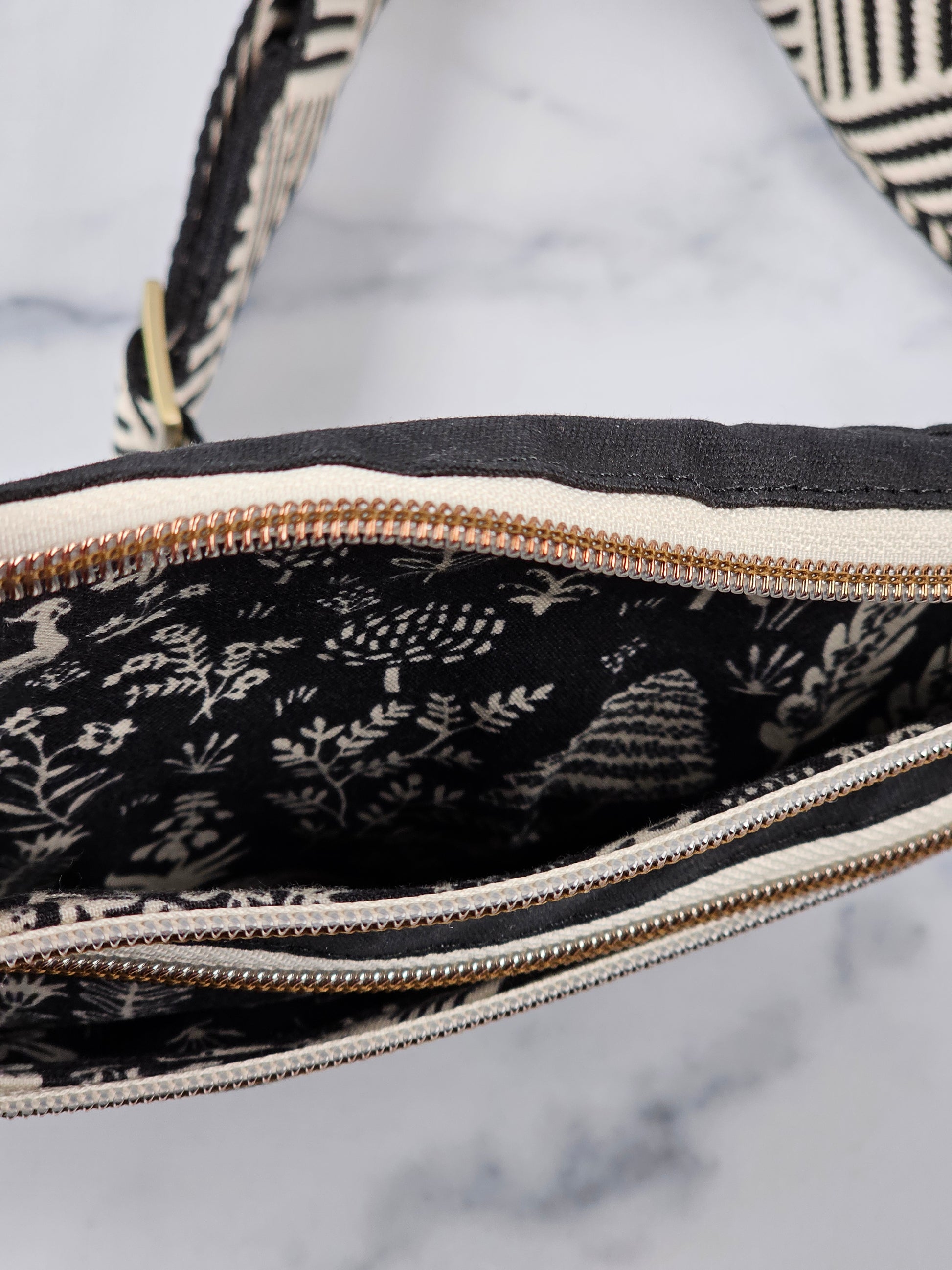 The front zippered pocket keeps your keys, lip balm, or small essentials close at hand, while the main compartment features an fun Rifle Paper Co., peacock and floral lining that adds a touch of personality and charm every time you unzip it. The adjustable woven strap with a bold black and cream pattern adds a modern twist and ensures a comfortable fit- whether you wear it crossbody, around your waist, or over your shoulder.